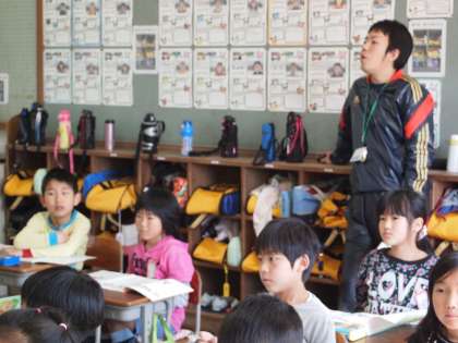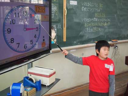 2年1組でも時計の見方で,時間と時刻の違いについて考えあっていました。大型テレビを使って友だちに一生懸命説明しているところです。