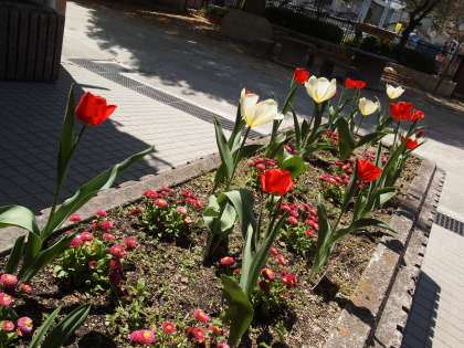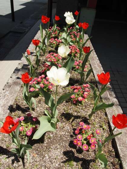 本館入口の花壇にチューリップがきれいに咲きました。よく見るとすごく行儀よく並んでいます。新年度が始まってどのクラスでも「並び方」を練習することが多いと思いますが,このチューリップのようにきれいに並べたらいいですね。