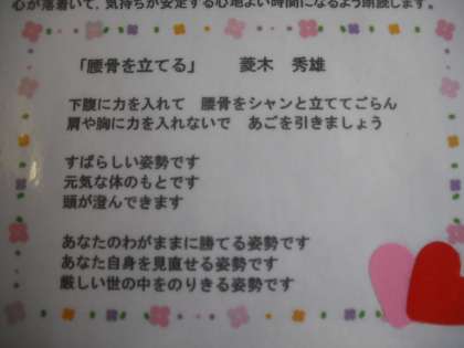 子どもたちの姿勢については,いろいろな場所や機会で気になり,本校の健康課題だとも言えます。正しい姿勢を定着させるためには,粘り強い日常的な指導の継続と,家庭とも連携をとり,よりよい生活習慣の定着を図る必要があります。今年度,毎日継続できる取組として,菱木秀雄さんの「腰骨を立てる」という詩を健康観察の前に朗読することによって,朝から「姿勢」について意識する取組を始めました。ご家庭におかれましても,「正しい姿勢」を意識し,楽な姿勢が癖にならないように,ご指導,ご協力をお願いします。