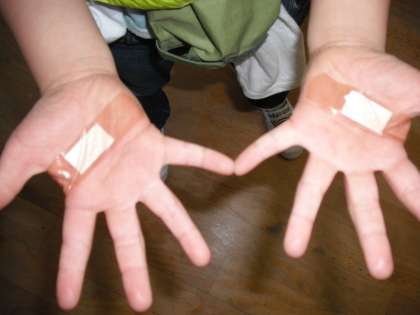 1年生の男の子の手の平です。多きな「まめ」ができ,皮が破れてしまいました。話を聞くと,「うんてい」で遊んでいた様です。この時期,慣れない一輪車にチャレンジして転倒したり,うんていで横棒を1本ずつ渡っていってまめができたり,この時期ならではのケガが出てきます。これもみんなが通る道。何事にもどんどんチャレンジして,安全に楽しく過ごして欲しいです。