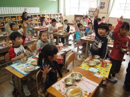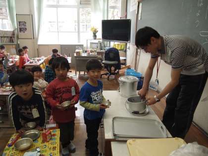 2組ではちょうど先生が子どもたちのおかわりをしているところでした。「みんな給食はおいしいかい?」と尋ねたら,ぜんいんが「は〜い!」と大きな声で答えてくれました。
