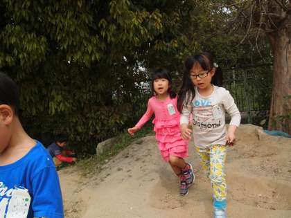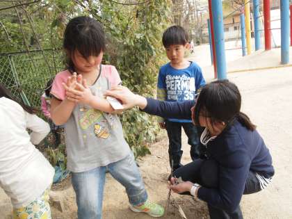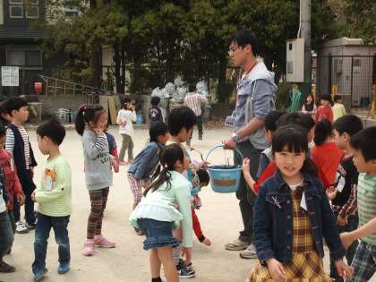 「集まりなさ〜い」の声が先生からかかりました。一斉に子どもたちが先生のもとに集合します。いろんなものを持って集まってくるのが面白かったです。