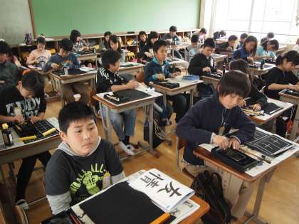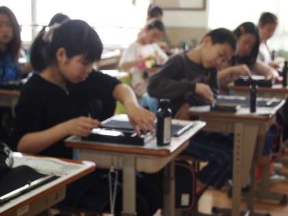 6年1組の教室からは墨の臭いが流れてきました。思わず姿勢がピンと伸びます。いわゆる「立腰(りつよう)」ですね。今日は「友情」という文字で,「へんやつくりに気をつけて書こう」ということです。集中力も素晴らしかったですよ。