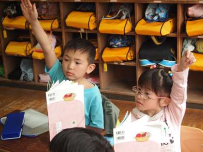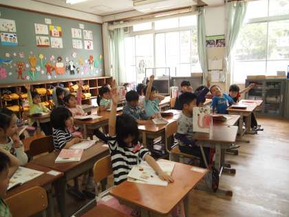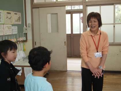 1組ではあいさつの仕方の実演を子どもたちがやってくれています。テレビの見本のようにできているかどうか…,一生懸命先生の顔を見てあいさつしようとしている姿がかわいらしかったです。