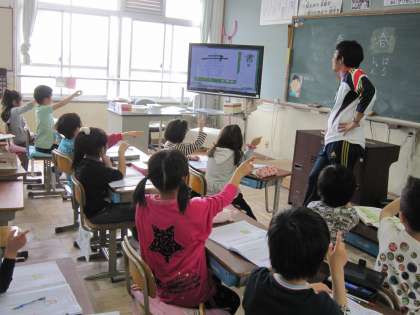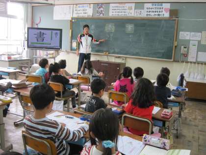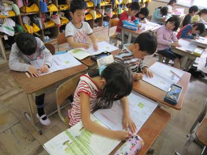 2年1組では,春と書という二文字を学習していました。コンピュータソフトを使って筆順を確かめながら練習をしていました。