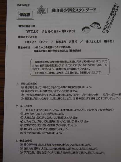 昨日の放課後,教員みんなで『嵐山東スタンダード』の帳合い作業をしました。学校教育目標の実現に向けて学習や学校生活の規律や心構えについて記したものです。明日,金曜日にお子達を通じてお渡しします。この1年,私たちは学校運営や学級経営の指針といたしますので,保存しておいていただきますようお願いいたします。