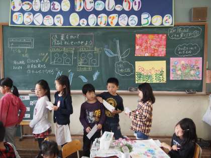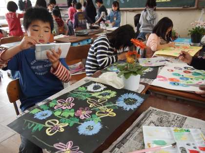 3年2組は図工の時間です。花に色を付けています。「くきや葉をていねいにかいて仕上げよう」ということですが,みんな集中してやっていましたね。