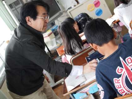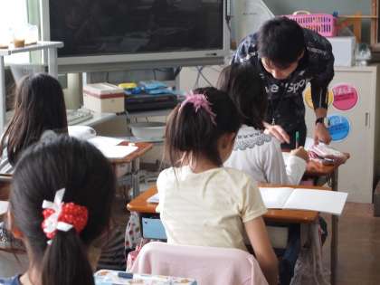 5年1組は算数です。「整数と小数」で何倍か・何分の一か…などとやっていました。ちょっとややこしいのですが,みんな落ち着いて考えられていましたね。