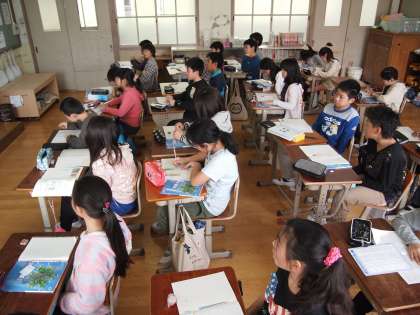 6年1組の算数の時間。線対称の学習です。指名された子が前に出てきて,みんなにわかるように工夫しながら説明しています。