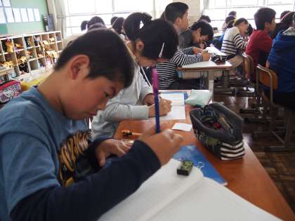 6年2組でも同じ算数の時間でした。図形を紙で切り取りながら,対照の中心をさがそうと頑張っていました、