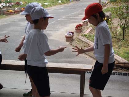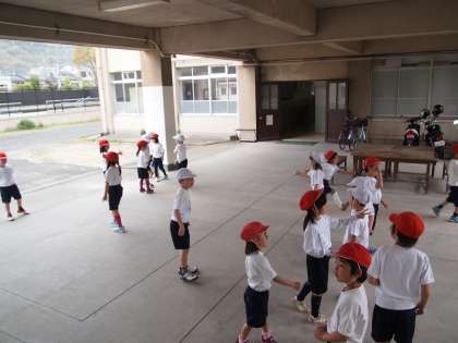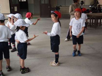 1年1組は大渡りろうかでじゃんけんゲームの真っ最中。昔,みなさんもされた「グリコ」「チョコレート」などという遊びです。みんな笑顔でやっていました。