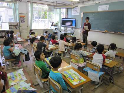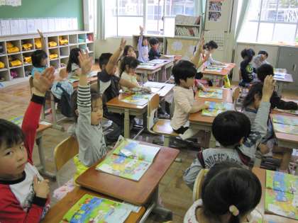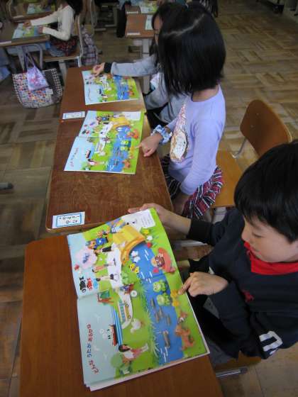 1年2組では,音楽の教科書の絵を見て,知っている曲を発表し合っていました。