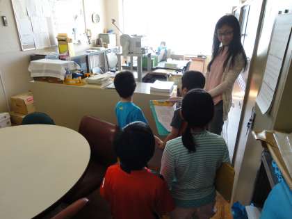 事務室を見学に来ました。量りや印刷機や冷蔵庫など,