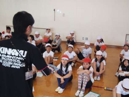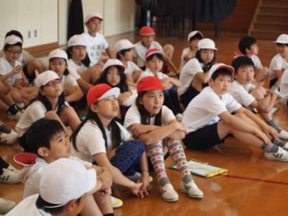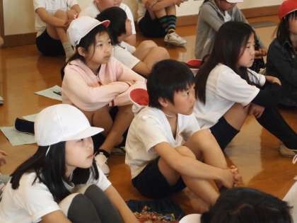 2校時5年生は合同で体力テストがありました。今日はシャトルランと握力です。先生の話を子どもらは真剣に聞き入っていました。