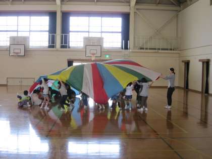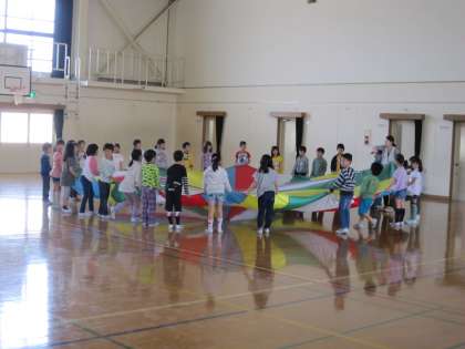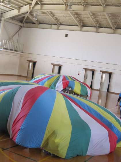 支部の育成学級のお友達が,5月下旬に本校に集まって交流会をします。そのとき,2年生と集まってくれたお友達たちとで,バルーンを使って交流をします。今日は,本校のあおぞら学級のお友達と2年生が,バルーンを使って交流をしていました。