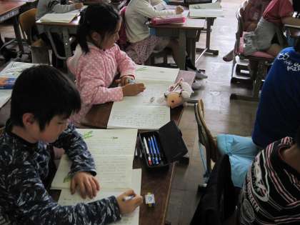 1組では,「たんぽぽのちえ」を読んで,「〜がわかりました。」「いちばんふしぎにおもったのは〜というところです。」という文を使った感想を書こうとしていました。