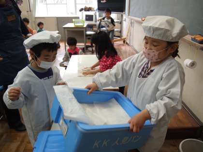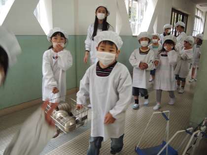 1年生の給食の準備は6年生が手伝ってくれています。ここという時に頼りになる6年生のお兄さんとお姉さんです。