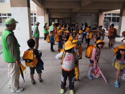 帰る時間になりました。見守り隊の方が来てくださってにぎやかに帰っていきます。