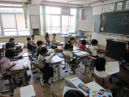 今日の2年1組では,音読のチェックカードに子どもたちが記入していました。