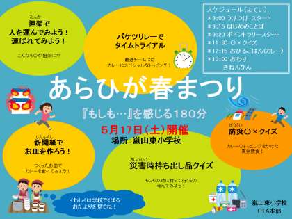 バケツリレーでタイムトライアルなど,楽しみながらもしもの時に役立つ「あらひが春祭り」5月17日(土)9:00より受付スタート。13:00終了予定。