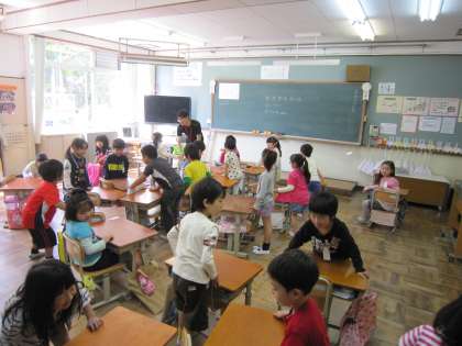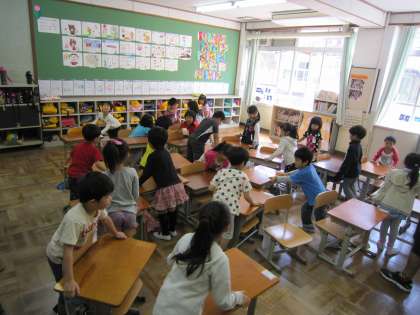 自分の机と椅子を新しい場所に運んでいました。ある子は「先生,しんどいよ。」と机と椅子を教室の端から端へと移動させるのに疲れた様子でした。