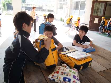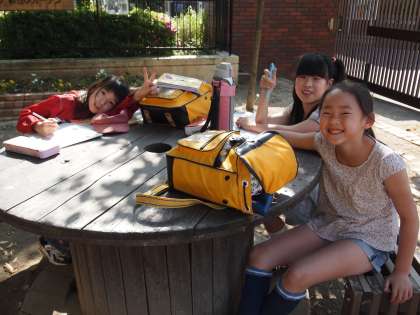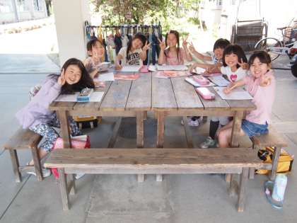 大わたりろうかやクスノキの木の下のところでは,子どもたちがノートやドリルを広げていました。「何してるの?」「宿題してんねん!」とびきりの笑顔でした。
