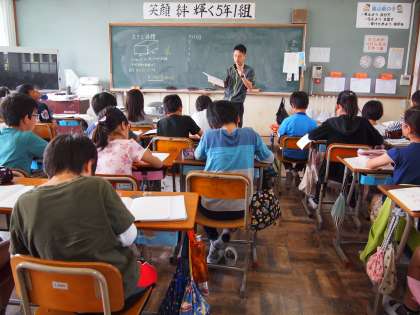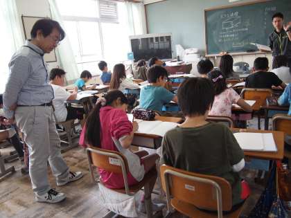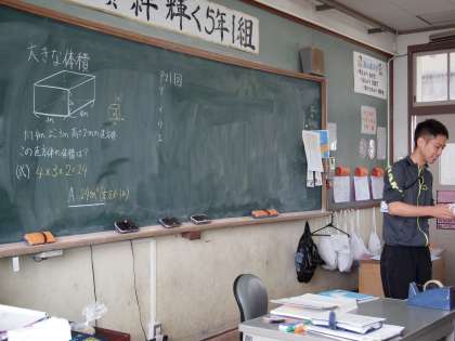 「大きな体積」の学習をしていた5年1組。いつもは「平方センチメートル」の単位をつけているので,注意深く「平方メートル」の単位をつけないといけませんね。