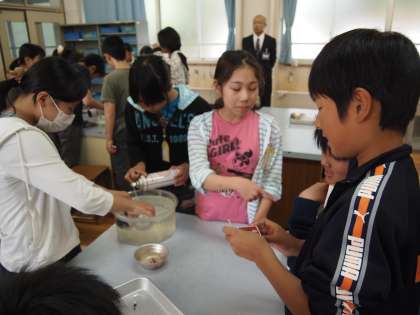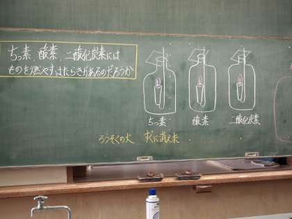 6年2組は理科室で「ものの燃え方」です。酸素・二酸化炭素・窒素を比較していました。結果はどうでしたか?