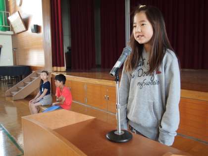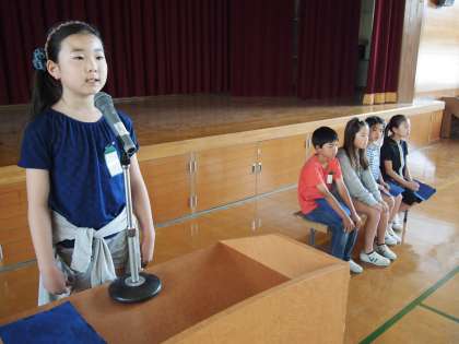 本校の学校教育目標の中の重点課題が つけたい力を明確にした『言語活動』 です。全校児童の前で伝えたいことを伝える力や,発表者の思いに寄り添いながら聞き取る力を育てたいと思っています。