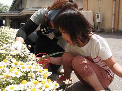このところずっと管理用務員さんがいつも花壇の手入れをしてくれています。その様子を見ていた子がお手伝いをしてくれていました。園芸用のはさみを使って花を整えてくれていたようです。