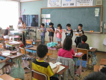 テストの後には,白いぼうしの音読劇にもう一度チャレンジしたいグループの子ども達が前に出て,役割り読みを披露していました。もう一度頑張りたいという気持ちって素晴らしいですね。