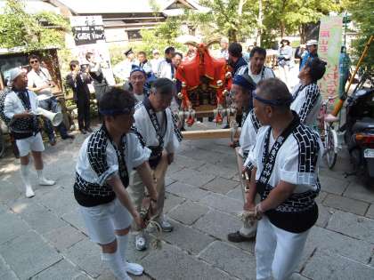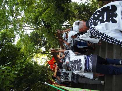 神社の石段は保存会の方々が神輿を担いで上がられました。