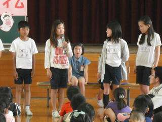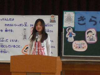 『嵐山っていいな』の発表です。私はこれからも嵐山のいいところをいつまでも残せるように,自然も人も大切にしていきたいと思います。「将来は,困っている人に声をかけられるやさしい人で,相手の気持ちがわかる人になりたいな」と思います。というところが心に残りました。