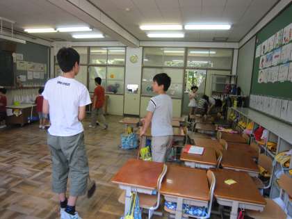 1年生の教室では,6年生と一緒に掃除をしていました。