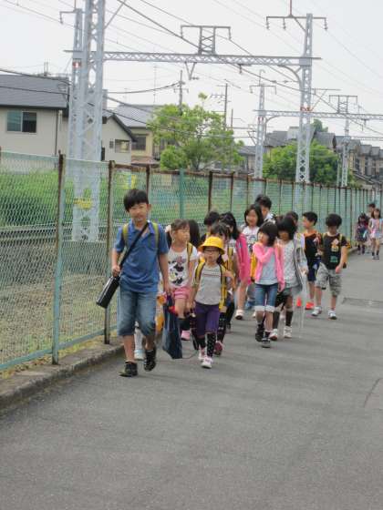 今日は6年生は修学旅行に行っています。1年生から5年生で集団登校をしました。