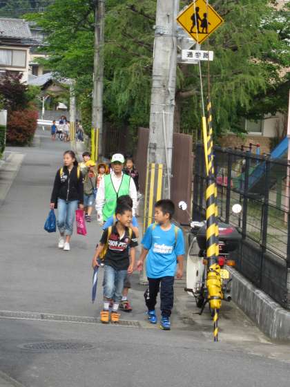 いつもは6年生が先頭を歩いている班が多いのですが,今日は5年生や4年生が先頭を歩いています。いつもと少し違う登校風景です。