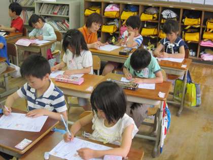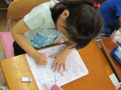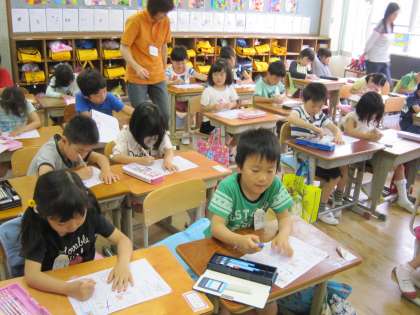 書けた子から,先生に見てもらって○をもらっていました。お直しをする子も中にはいました。四角いますのどこに書くかできれいかどうかが決まります。しっかりと意識して練習を重ねてほしいですね。