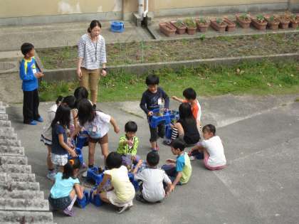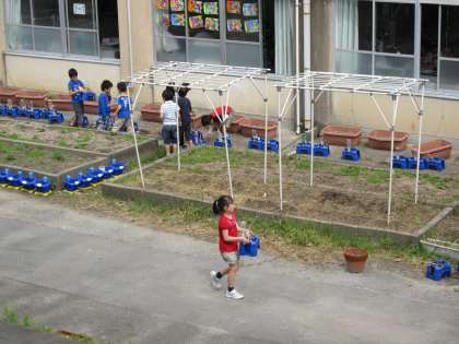 2年生は,生活科の「ぐんぐんそだて みんなのやさい」という学習で,トマトを育てます。1年生の時に使っていた植木鉢を使って植えます。先ずは,土の入れ替えのために植木鉢を運んでいました。