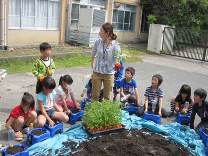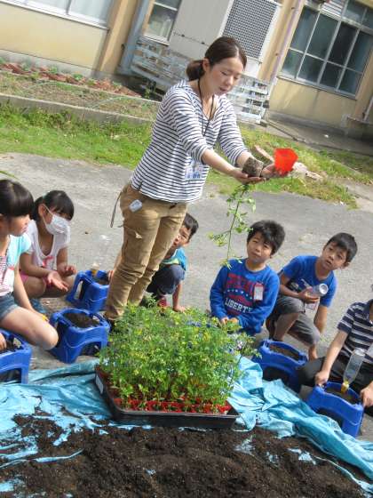 担任から目の前で植え方の実演をしてもらいました。みんなしっかり聞いていたので,スムーズに植えることができました。