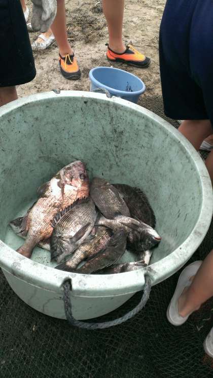 網を引き揚げると,そこにはクロダイをはじめ大漁の魚が・・・思わずわきあがる歓声!