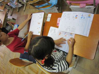 1年2組では,ひらがなの「な」と「お」の練習をしていました。
