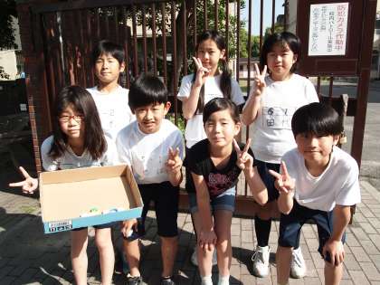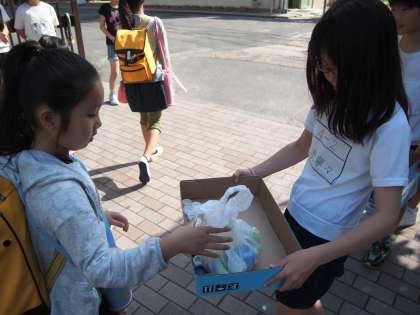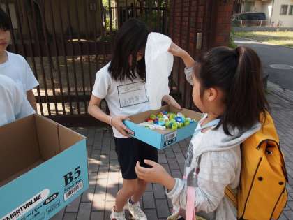 ペットボトルのキャップ集めの日です。5・6年の児童会の子どもたちが校門で活動してくれました。
