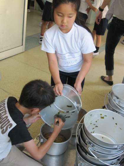 給食委員が待っていて,返し方のアドバイスをしたり手助けしたりしています。