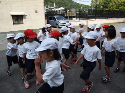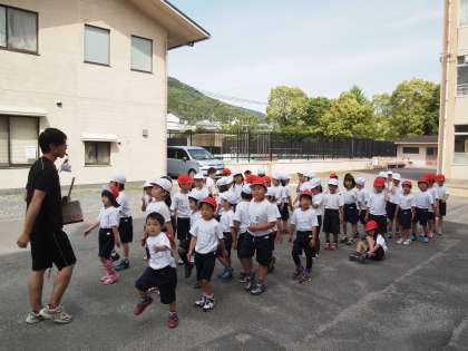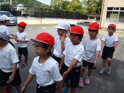 さぁ,1年生が運動場で運動会の練習を始めます。いつもここに集まって並んでいくようです。今日はどんなことをするのかな?
