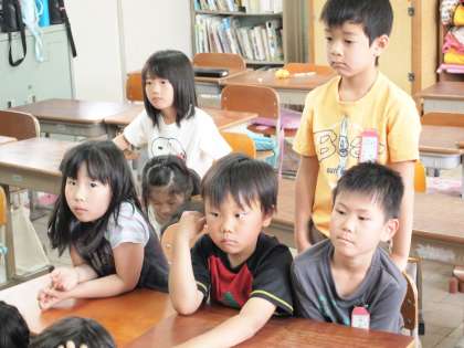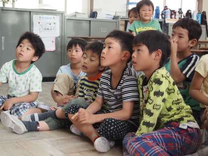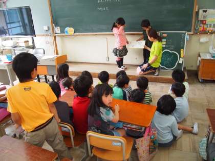 2年2組は読み聞かせの最中です。子どもたちと担任の先生で協力しながらやっていました。「おさるのジョージ」だったので,みんな興味深そうに聞き入っていました。