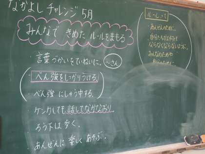 2年1組は学校ソーシャルスキル『なかよしチャレンジ』の時間です。昨年度から始まったもので,全校一斉に毎月同一テーマで学年に応じた内容に取り組んでいます。5月は「みんなで決めたルールを守る」です。心当たりがある子どもはたくさんいるのではないでしょうか。