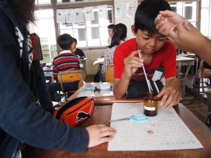 5年1組はでんぷんの性質について調べています。ヨウ素液で反応が出るでしょうか…。