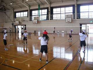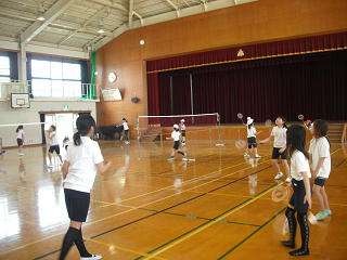 2人組でシャトルの打ち合いをしました。なかなか自分の思うところにコントロールするのが難しかったようです。まずはシャトルを落とさずに何回も打ち合うことができるようになることが目標ですね。