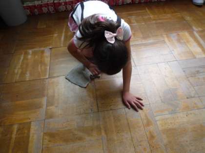 床やみぞの目に沿って磨いたり,掃いたりしている子どもがいます。いいですね!