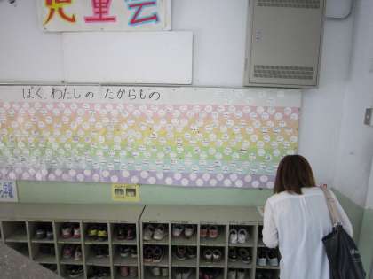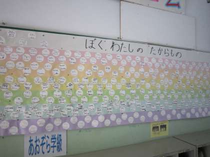 「ぼく わたしの たからもの」を全校で書きました。そして,中校舎1階に掲示しています。先日から子どもたちや教職員が自分の宝物を書きました。どんな宝物を書いているのかぜひご覧ください。